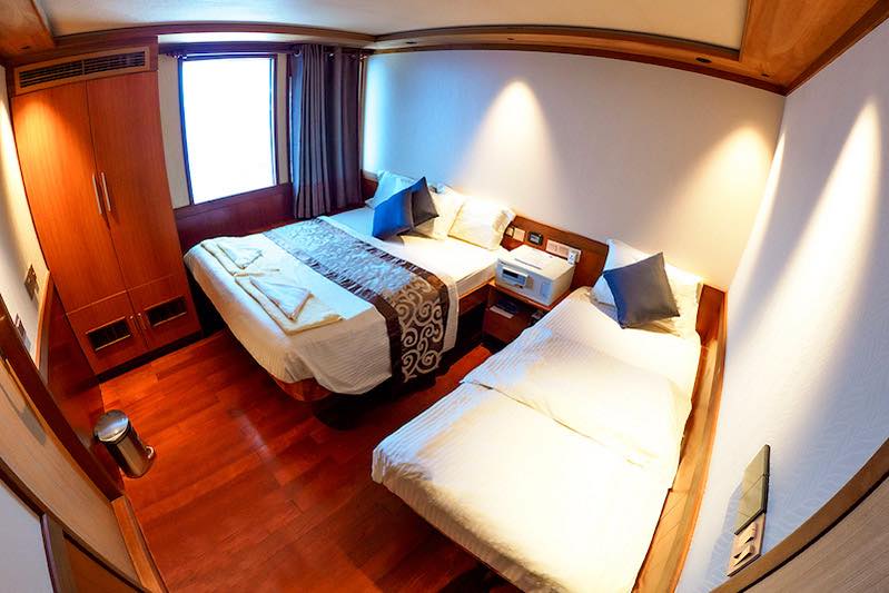 The Deluxe Double or Twin cabins have a double bed and a single bed with an en-suite bathroom and shower and are located on the lower deck