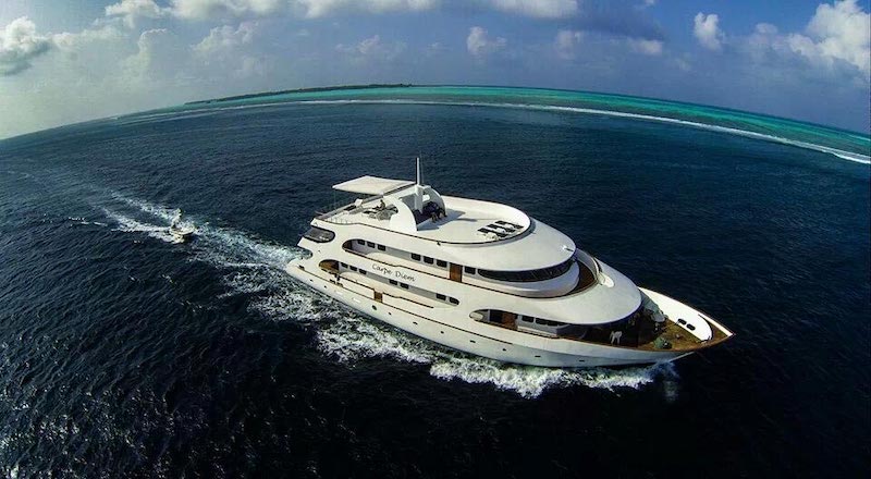 The boat is accompanied by a diving dhoni (tender) and a small speedboat (dingy).