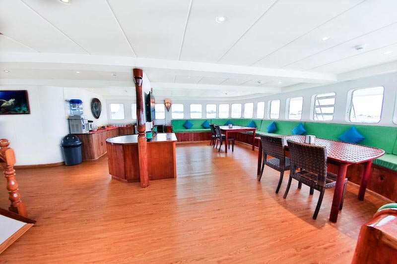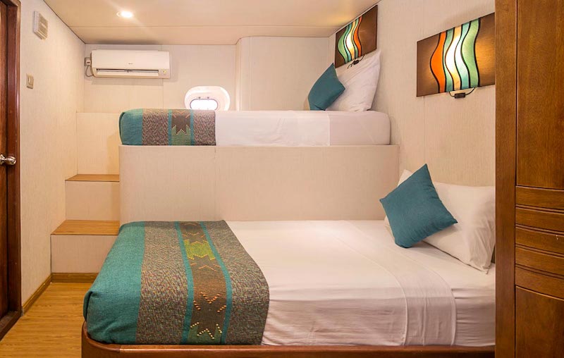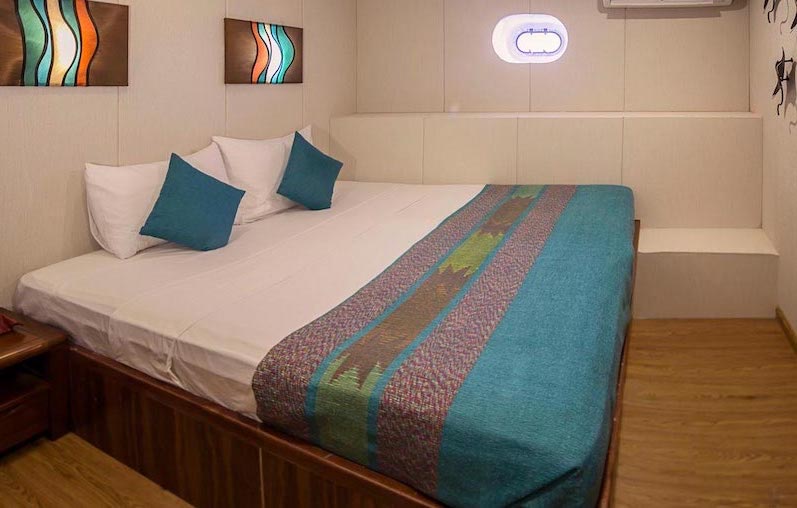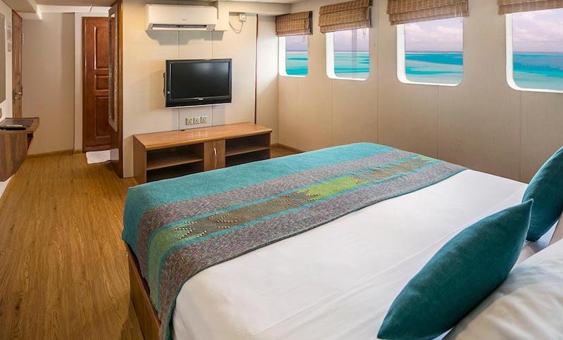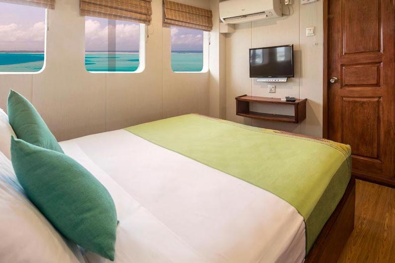 Opposite the suite on the upper deck is the big Deluxe cabin with a queen size double bed, flat screen TV plus DVD/MP3 player and 3 windows overlooking Maldives blue waters.