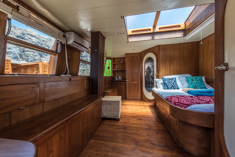 Carpe Diem Phinisi caters to a maximum of 8 guests in 4 cabins made up of 1 large double cabin on the main deck (Pala) and one twin or double cabin on the lower deck (Cengkeh) and 2 identical lower deck cabins that have a double and single bed and that can be a double / twin or triple cabin (Pandan and Kayu Manis)