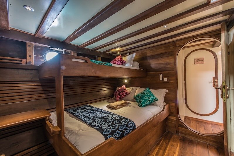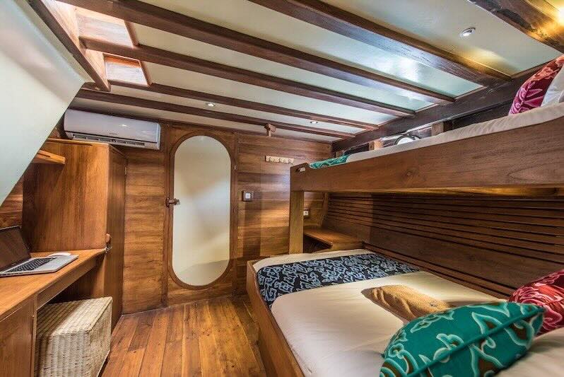 The two cabins Pandan and Kayu Manis are on the lower deck and are mirror images of each other and are capable of sleeping up to 3 guests in a double/single bunk bed configuration.