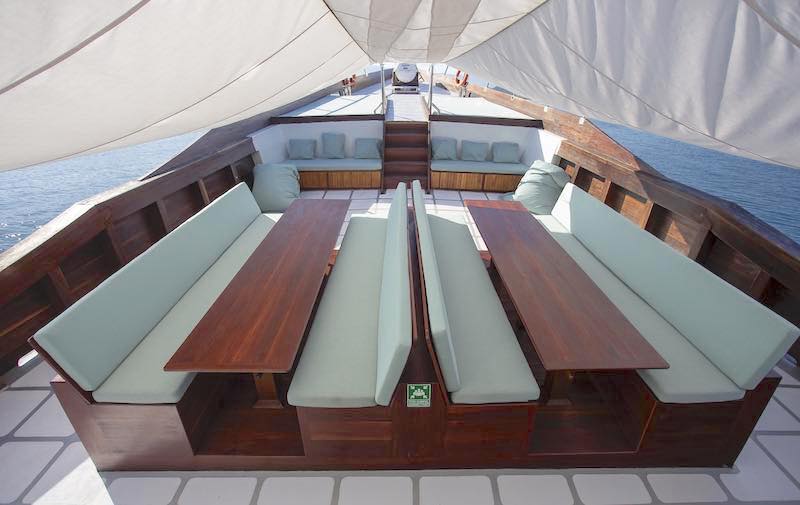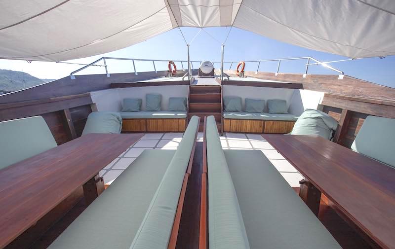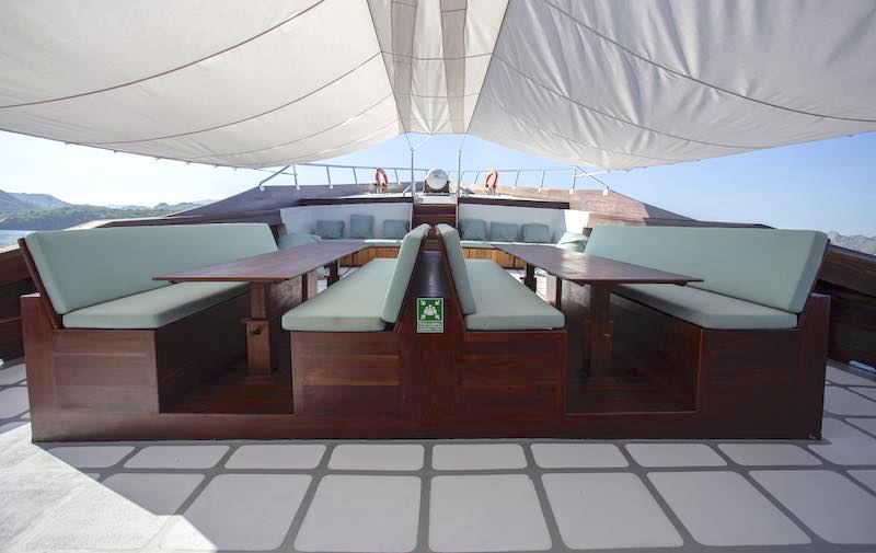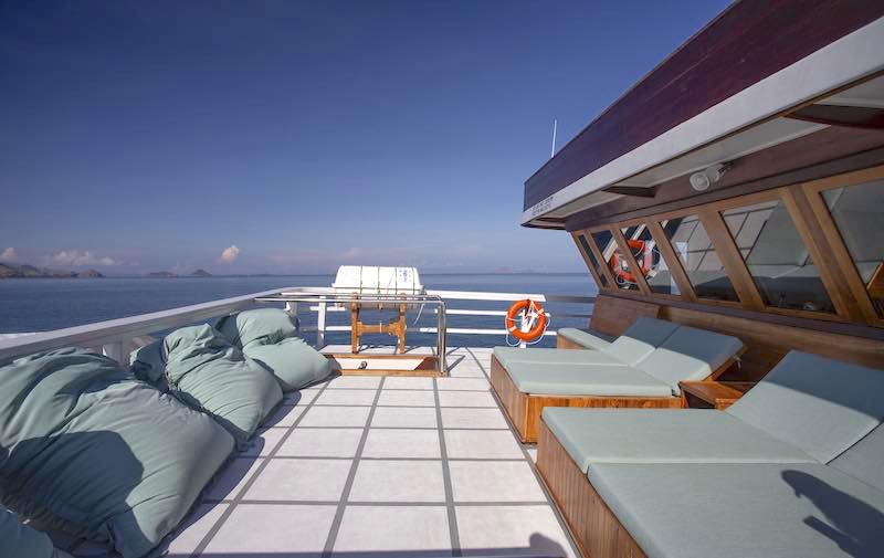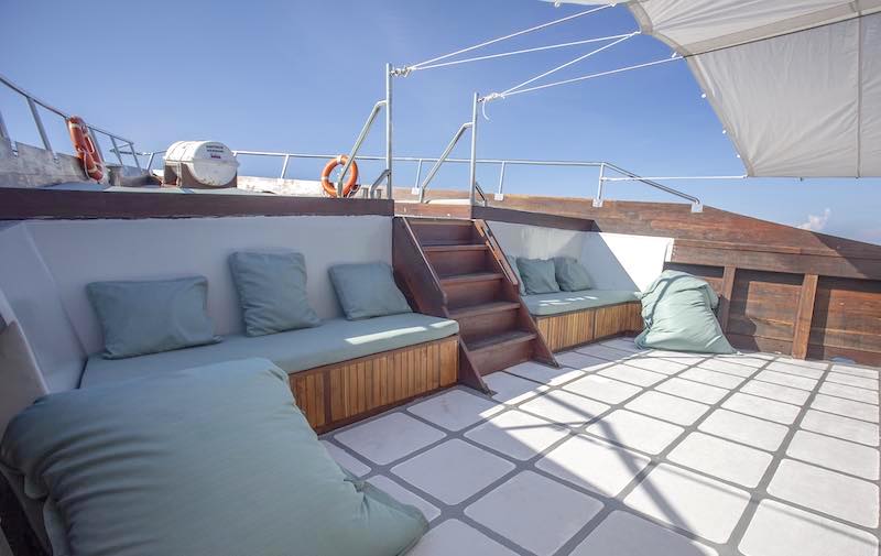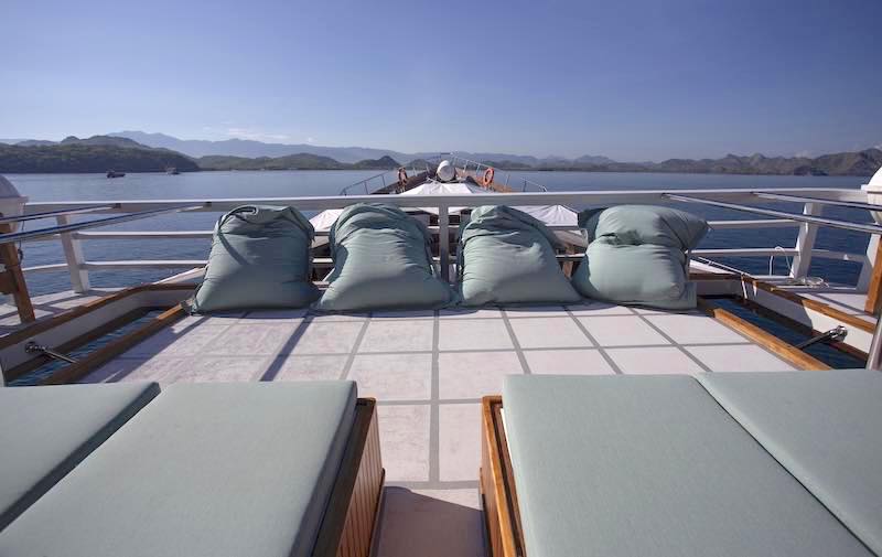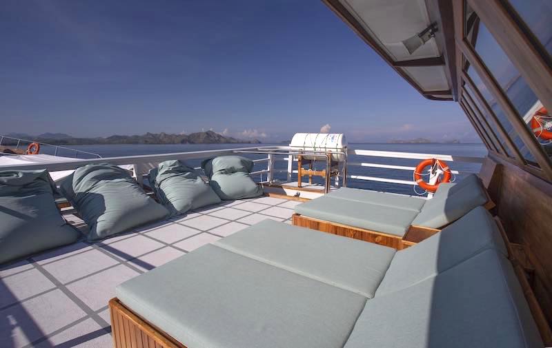 On the Upper deck is an Outdoor seating with deckchairs, beanbags, sunbeds and on-deck massage service.