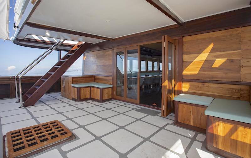 On the Main deck is an Air-conditioned lounge with comfy sofas, 49″ HD flat screen with digital movie, music and book library; board games.