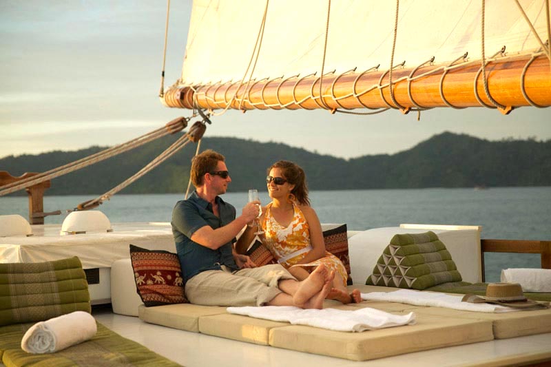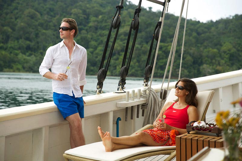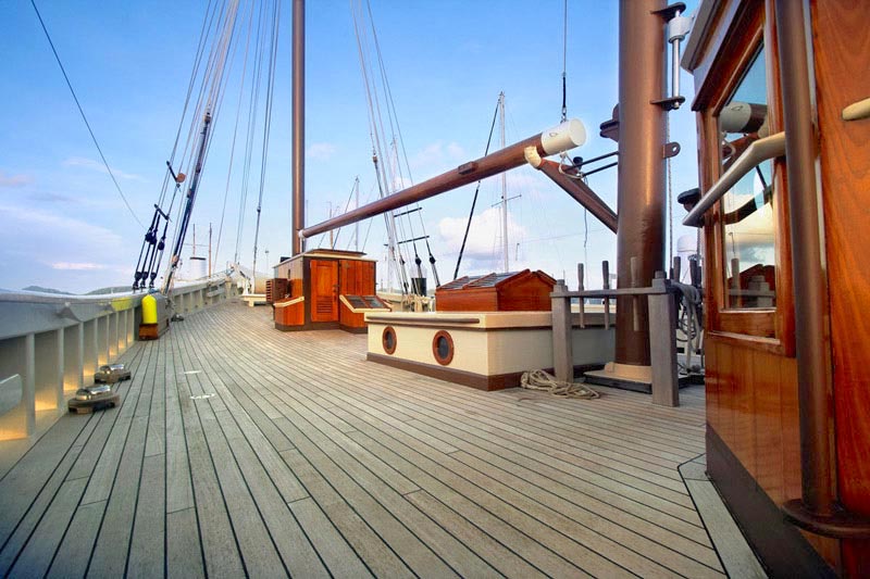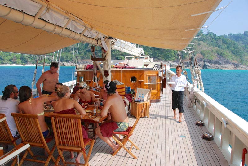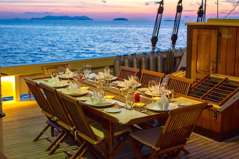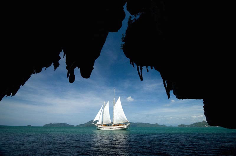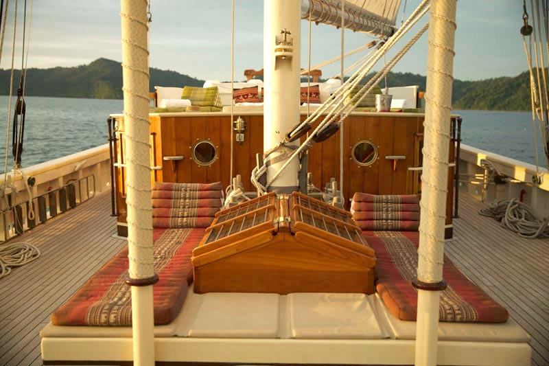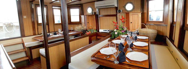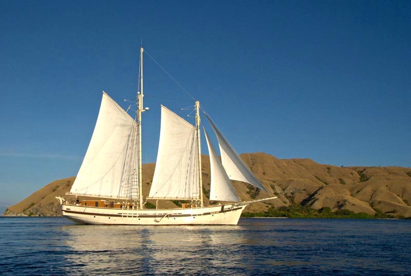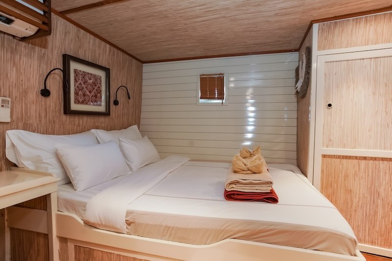 Raja Laut means King of the sea and this schooner type yacht comfortably accommodates 12 guests in 6 cabins (3 double bed cabins, 3 twin bed cabins), each with ensuite, mini safe, individually controlled air-conditioning and fan.
