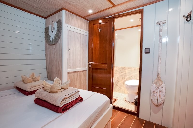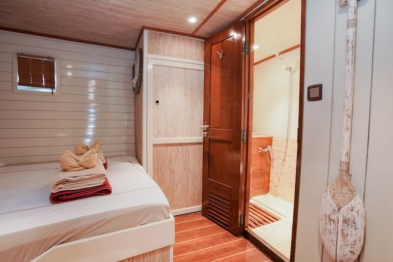 Raja Laut comfortably accommodates 12 guests in 6 lower deck cabins (3 double bed cabins, 3 twin bed cabins).