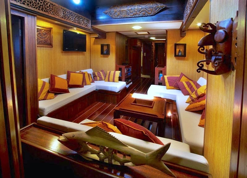 On the same level as the cabins is a lounge area, fully air-conditioned with a 49 inch HD flat screen, movie, music & book library, board games and mini-bar.