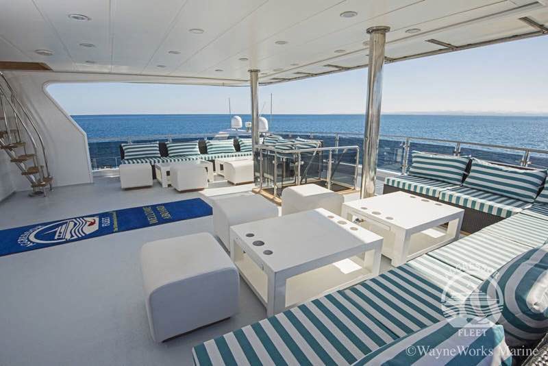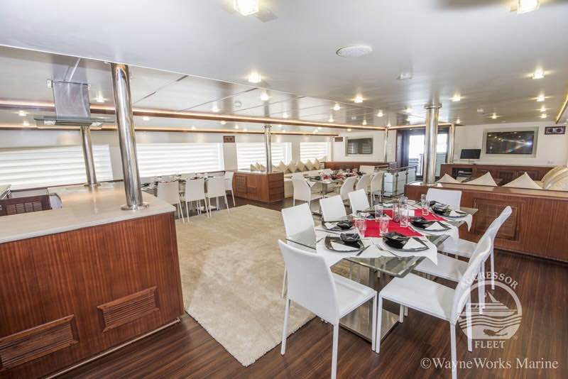 She cruises at 12 knots, has a beautiful spacious salon, sundeck, chaise lounges, deck chairs, bar, grill, and a complete photo/video center and accommodates 22 passengers in 11 staterooms; 8 staterooms with two single beds in each, 2 staterooms with Queen size beds and 1 stateroom with a king size bed.
