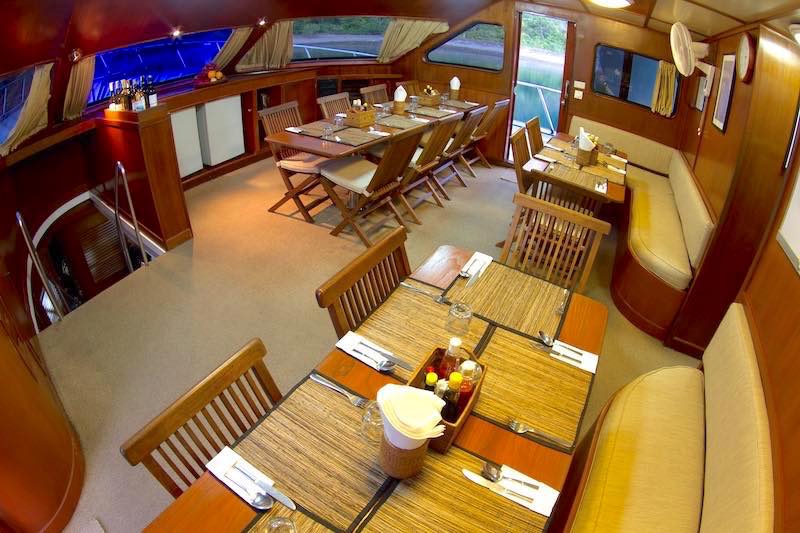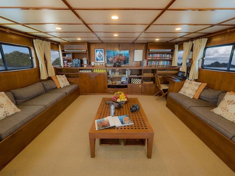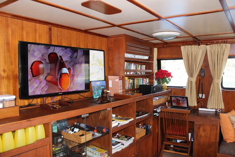 The saloon is large and spacious with lounge suites and big windows, bar fridge, tea and coffee facilities, TV/DVD, music center, library and a full selection of marine life books.