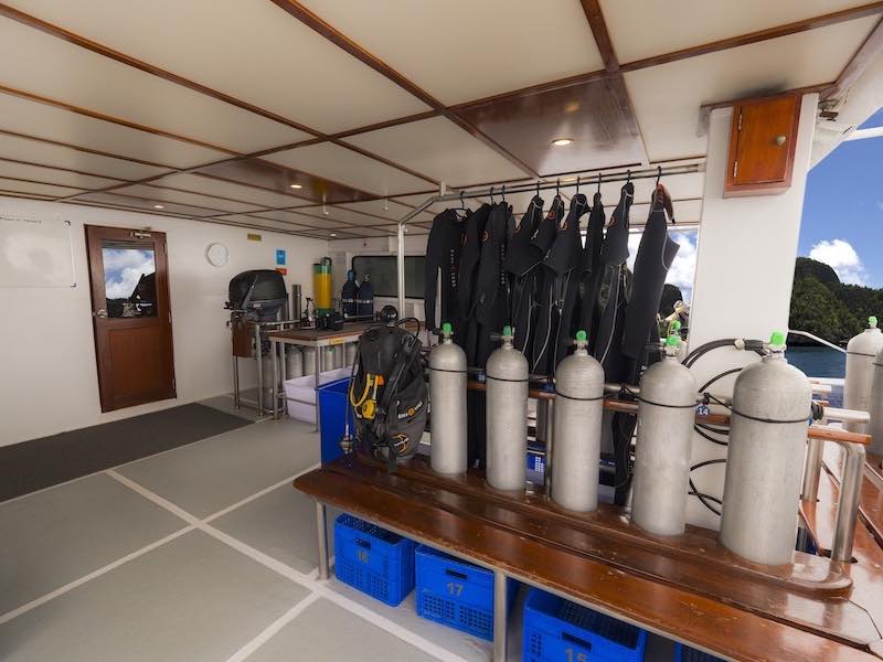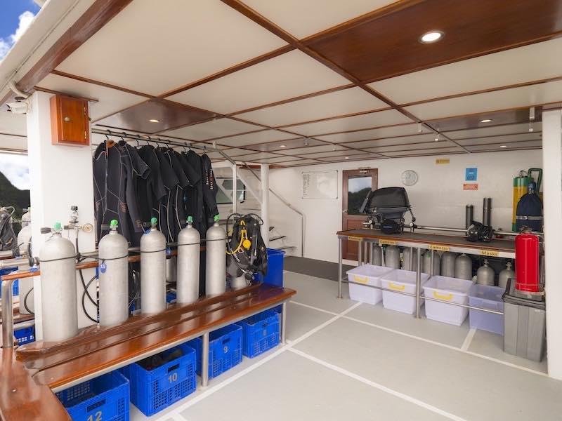 The dive deck is huge with plenty of room to gear up, individual boxes for your dive gear, camera table and loads of rinse tanks.
