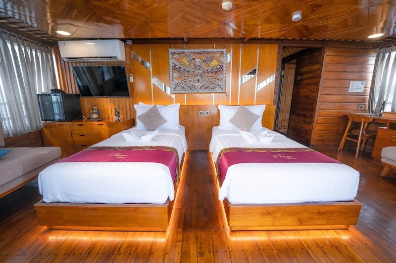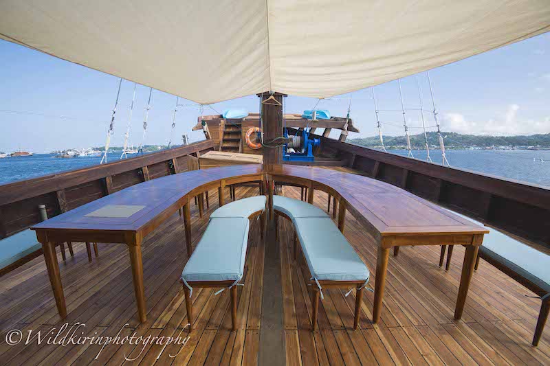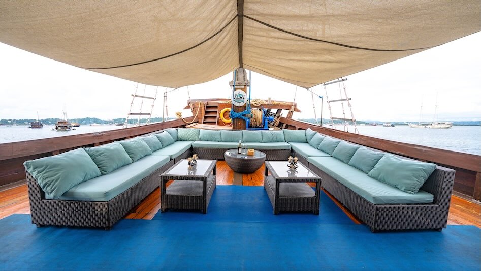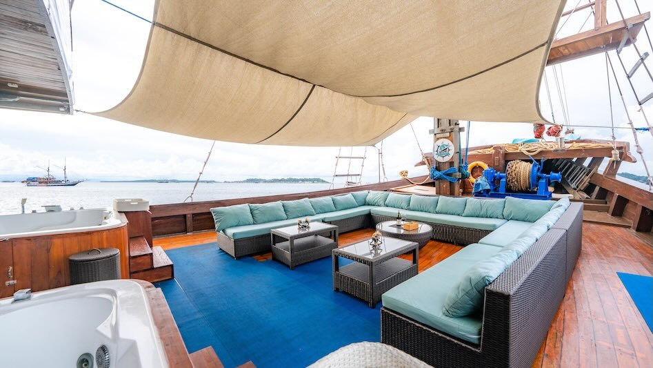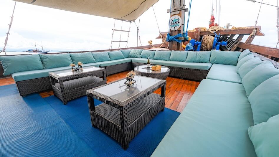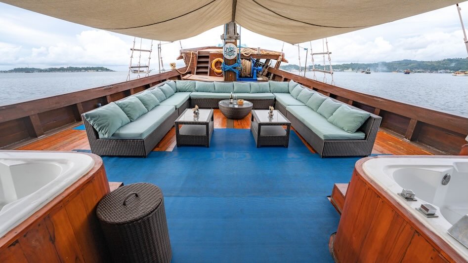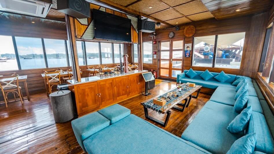 The main deck is the social hub of the ship, featuring two Jacuzzis and an outdoor seating area for relaxation while enjoying the stunning Indonesian scenery. The indoor air-conditioned salon and restaurant offer a cozy space for dining and entertainment, with a 55" TV, touch-screen karaoke, and a fully stocked bar.