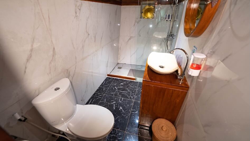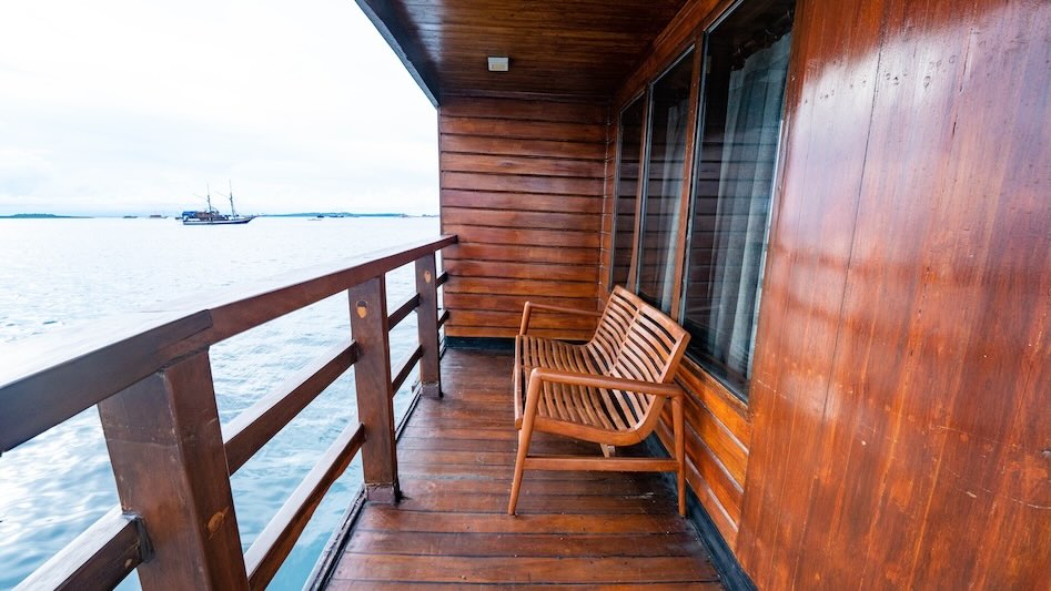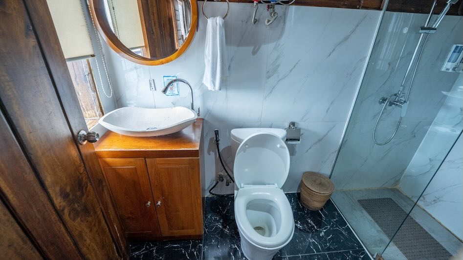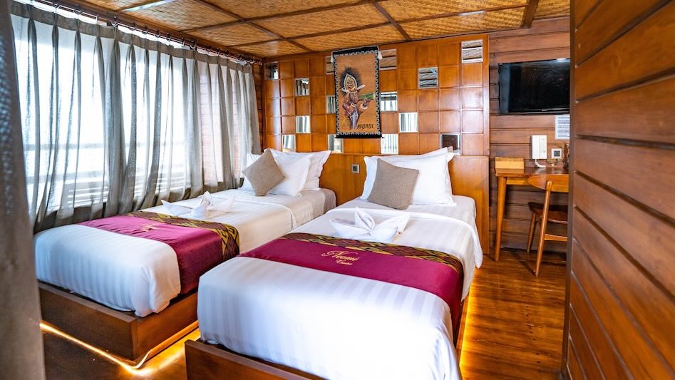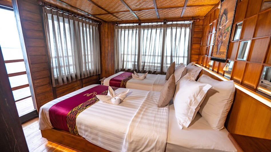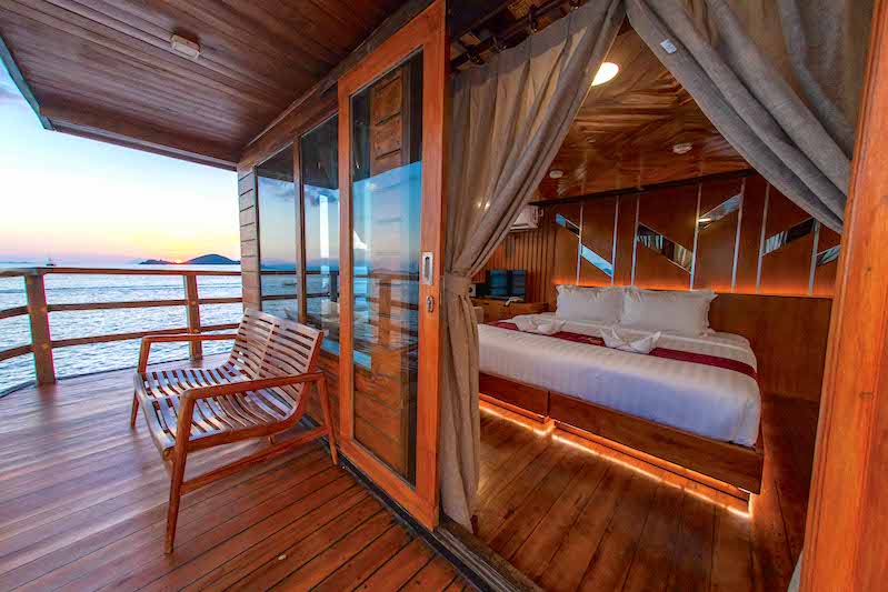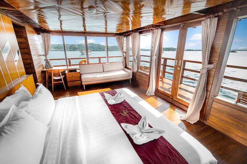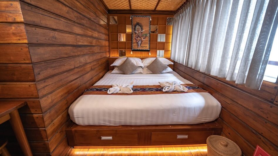 The main deck is the social hub of the ship, featuring two Jacuzzis and an outdoor seating area for relaxation while enjoying the stunning Indonesian scenery. The indoor air-conditioned salon and restaurant offer a cozy space for dining and entertainment, with a 55" TV, touch-screen karaoke, and a fully stocked bar.