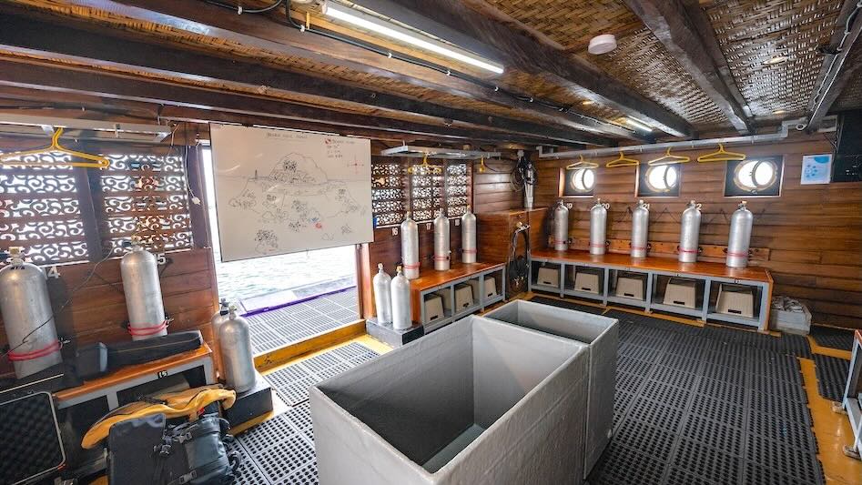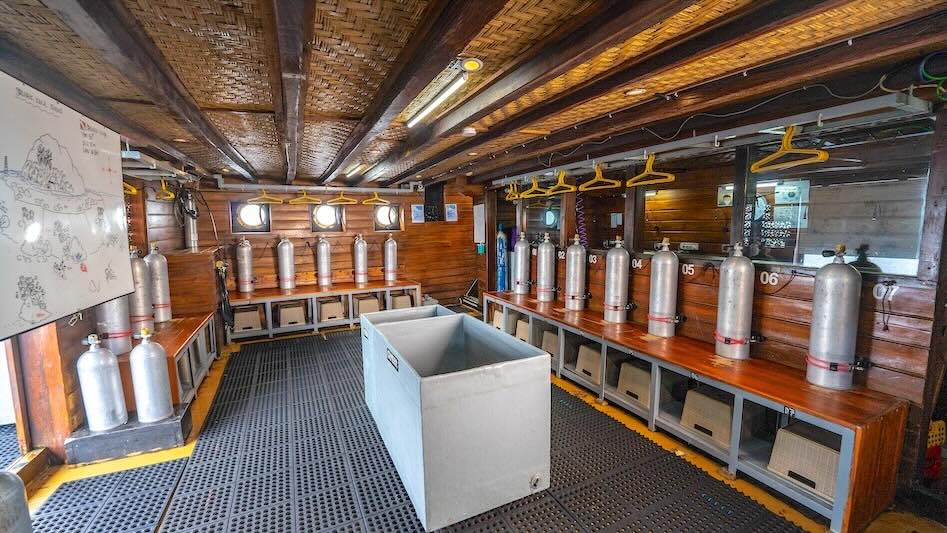 Divers are catered to with top-notch facilities, including a spacious dive deck with individual gear storage, nitrox availability, and a dedicated camera room.