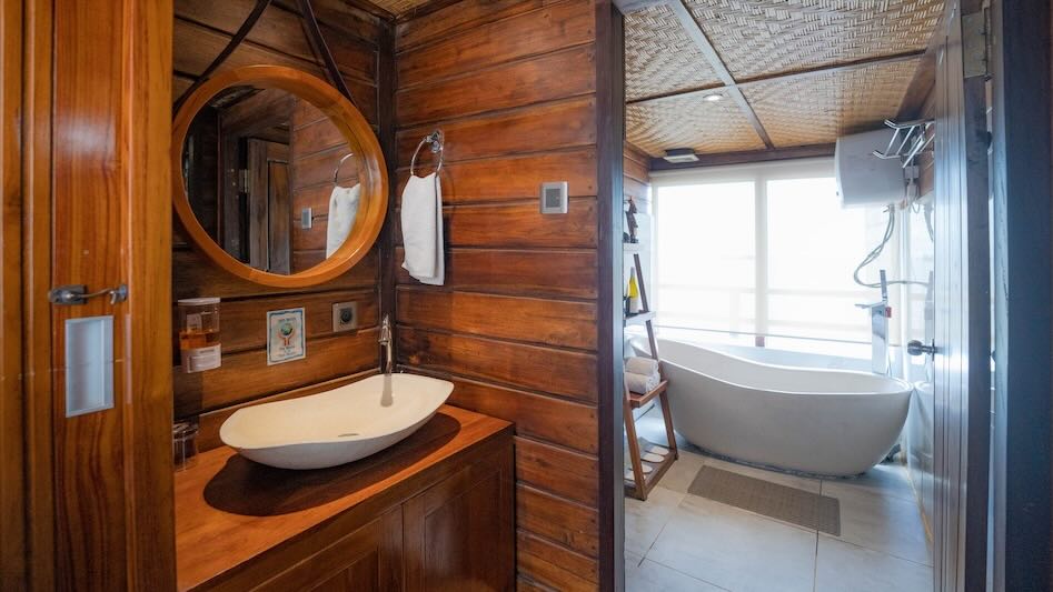 Guests can choose from various cabin options: three double or twin cabins on the lower deck, two twin or double cabins on the main deck, and on the upper deck, one double cabin, three twin or double cabins, and a spacious Master cabin with a private balcony and bathtub.