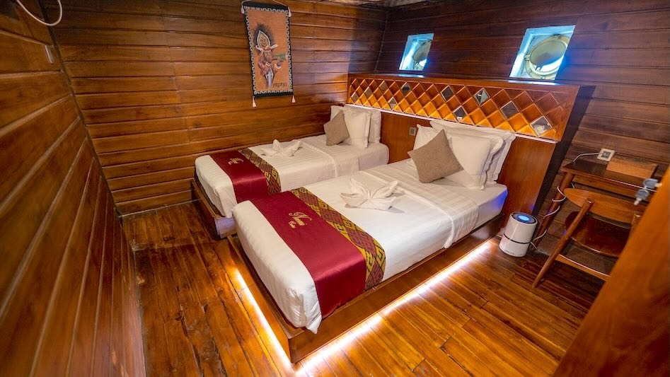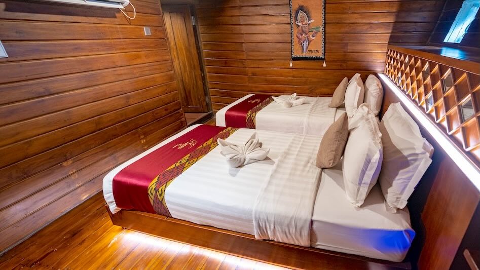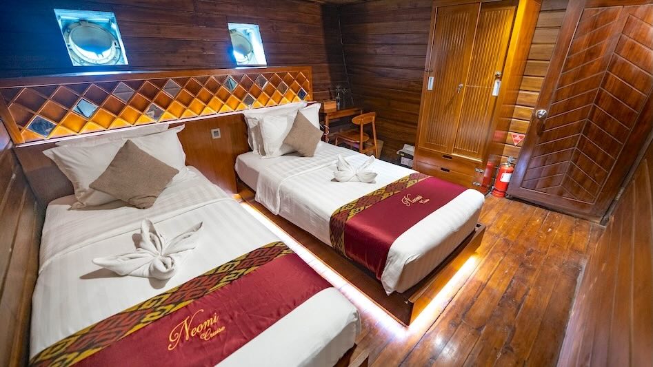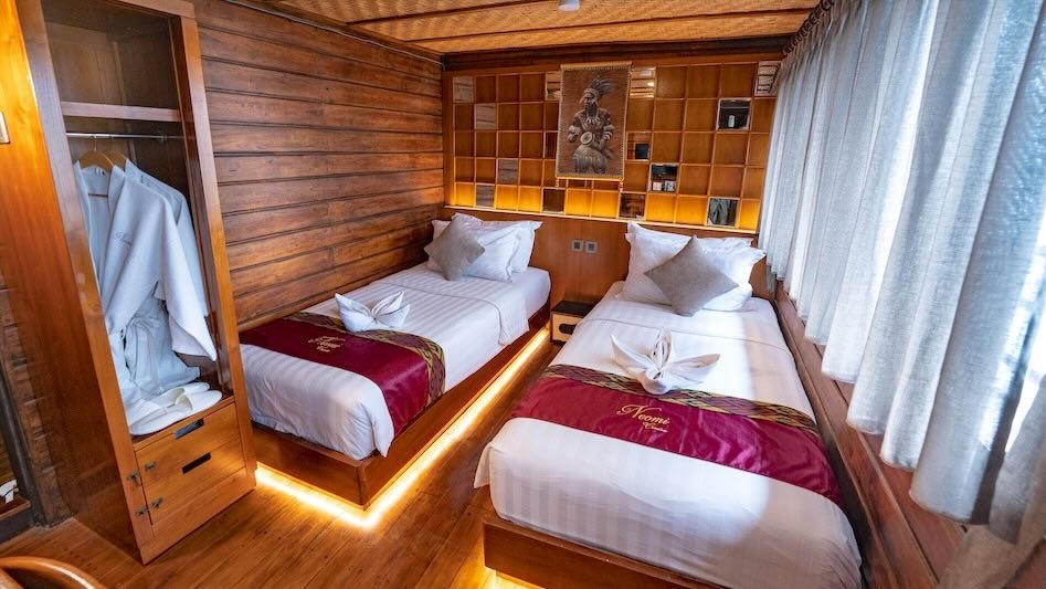 Neomi Liveaboard is a luxurious phinisi-style vessel designed to accommodate 20 guests (22 for a full charter) across 10 well-appointed cabins, offering a blend of traditional Indonesian craftsmanship and modern comforts.