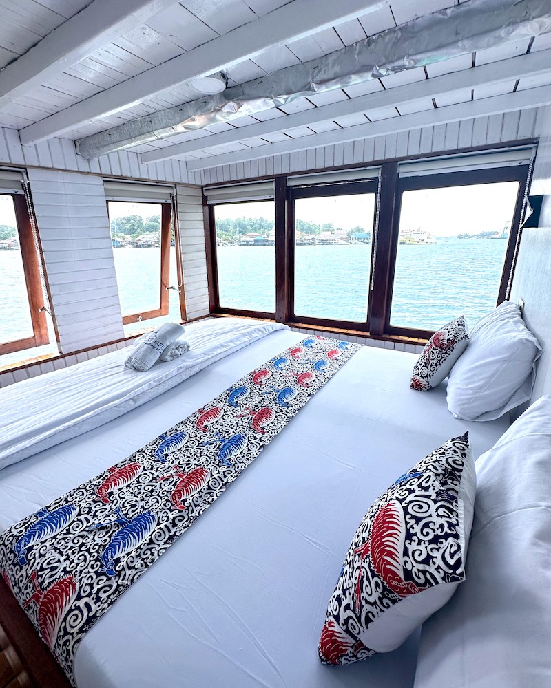 There are 2 Upper deck sea view suites, 3x4 meters, with large windows all around the entire space giving the experience of seeing views of the open sea, watching the sunrise and sunset from the comfort of an air-conditioned cabin.