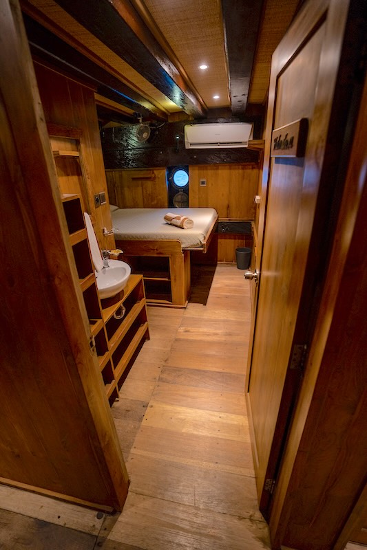 Each 10’ x 10’ cabin is named after a mystical Indonesian island and, depending on your reservation, is appointed either with a twin bed plus an upper bunk, or with a spacious double bed.
