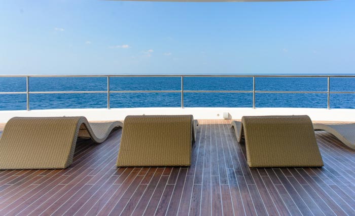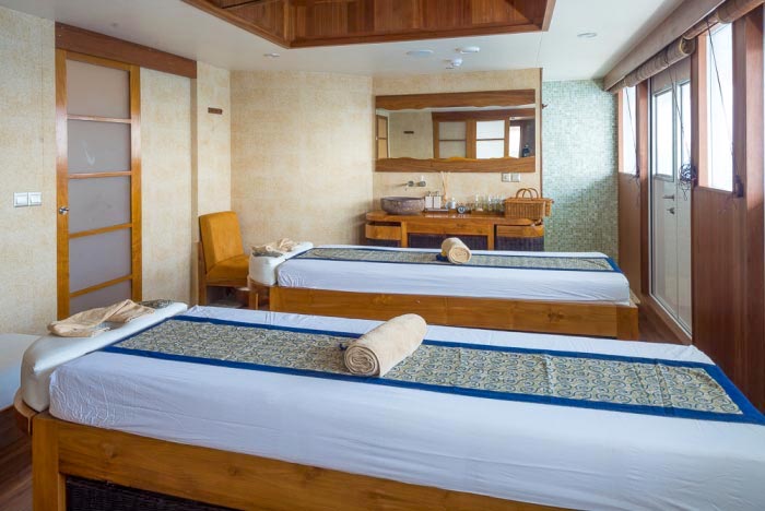 Only 18 divers with the option to use any of the 20 spa services on offer at an extra charge, Gourmet cuisine from all over world provided by highly trained chefs, bartenders and baristas, morning Yoga and fitness room including treadmill and bike, 1Gb free internet, Jacuzzi, Movie night under the stars, Kayaks, Sup and other water sports and a BBQ dinner on the beach and much more.