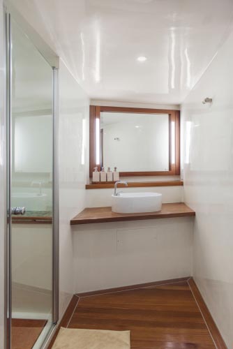 There is a queen-size bed and a lavish ruby-coloured sofa, that can be transformed into a comfortable third bed. As the Cowrie Suite spans the width of the bow it has four opening portholes, and the spacious en suite bathroom houses the largest shower on board.