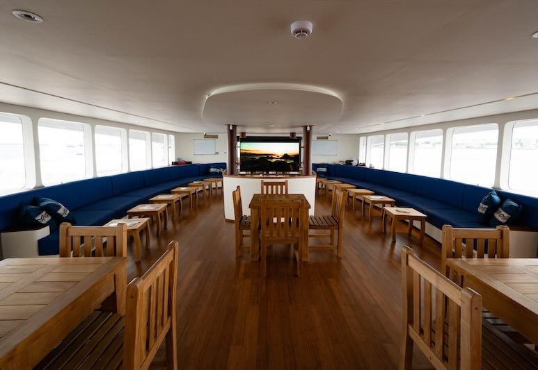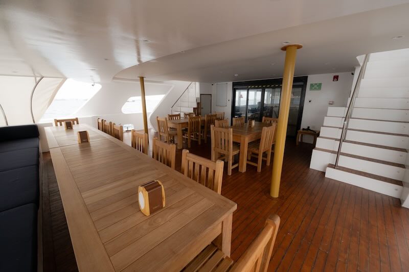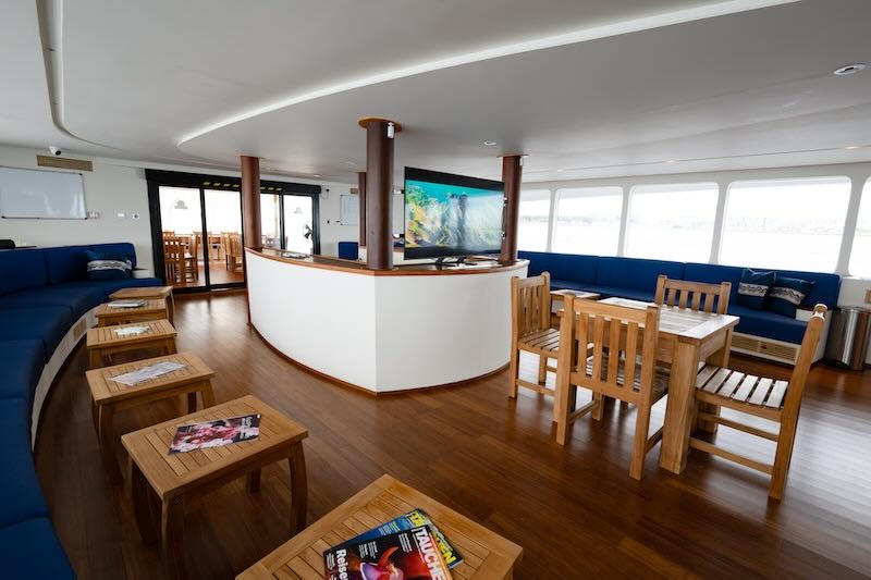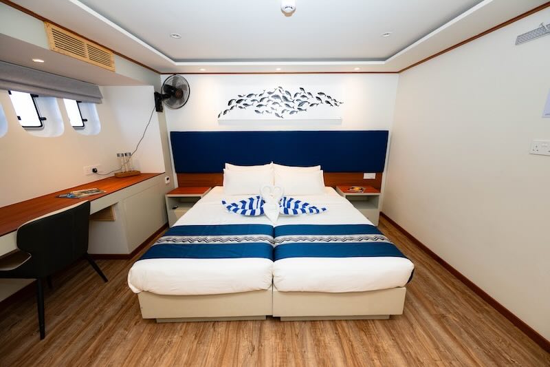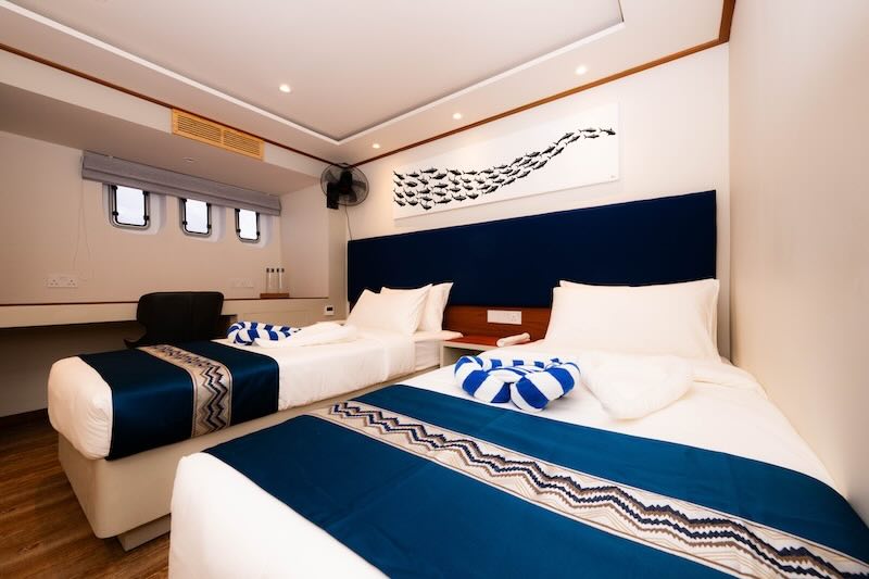 The boat has fourteen cabins over 3 decks, six with which have a sea view and with all of them having private bathrooms and air-conditioned also, ensuring you a comfortable journey through the hot climate of Maldives.