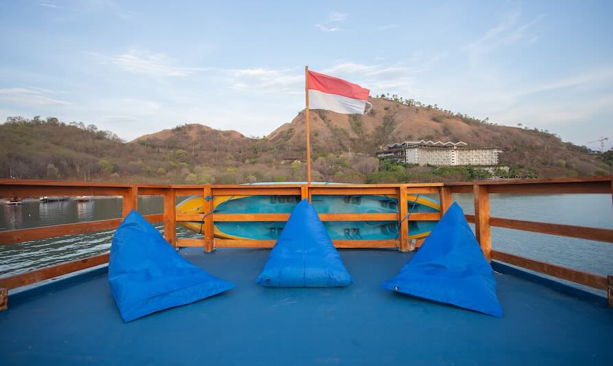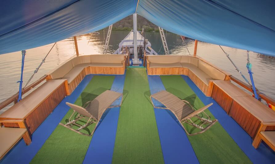 The sun deck, shaded by an awning, offers a perfect spot for sunbathing or simply soaking in the stunning views of the Indonesian archipelago.