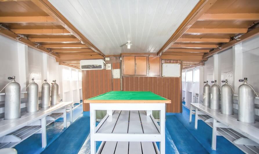 The dive platform is spacious and functional, featuring 12 gear-up stations and 20 scuba tanks, ensuring that all guests can prepare for their dives with ease.