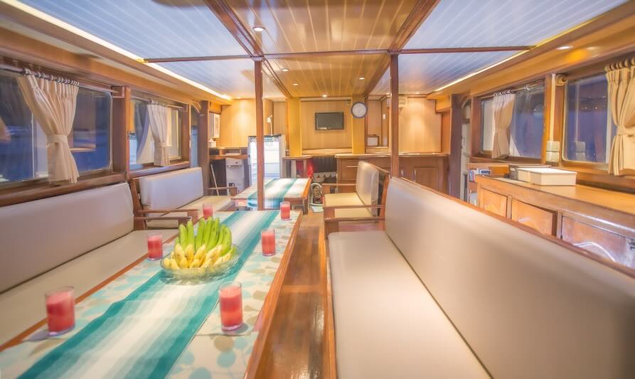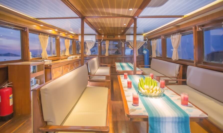 Meals are a highlight aboard TemkKira, with a dining area that serves a delightful mix of European and Indonesian cuisine, catering to a variety of tastes and dietary preferences.