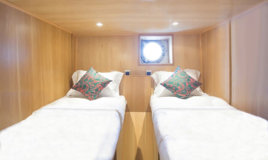 There is 1 Twin cabin on the Upper deck and 5 Twin or Double cabins on the lower deck.