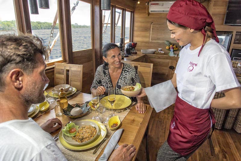 Tiaré offers a spectacular experience for divers as well as non-divers, with bright airy cabins, spacious bathrooms and a large front deck where you can socialize, eat under the stars or just relax in the Indonesian sunshine.