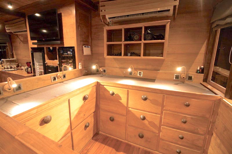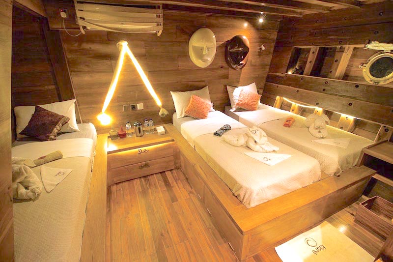 With 2 triple cabins that are spacious enough to accommodate two adults and one child or three adults, with under-bed storage to ensure ease of movement around the cabin. The other four cabins, two twin and two double, accommodate two adults each for a maximum capacity of 14 guests.