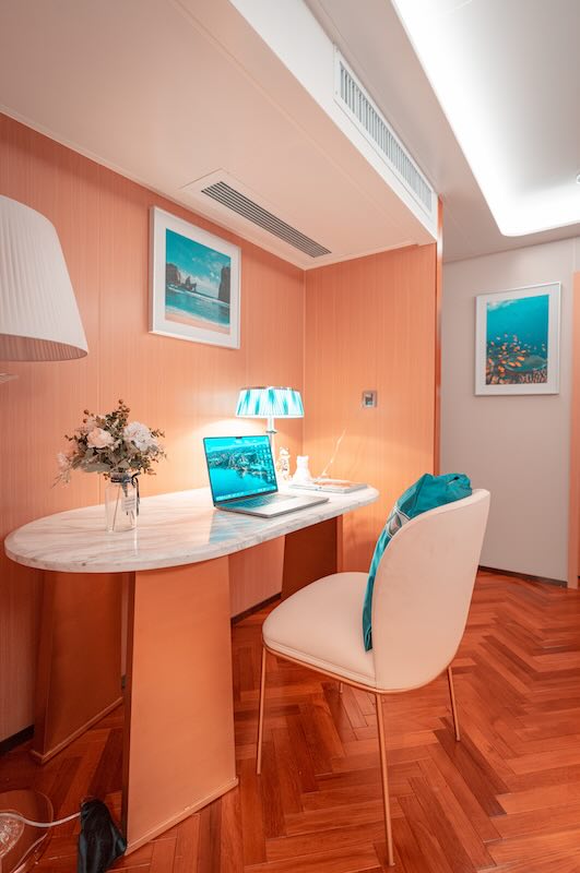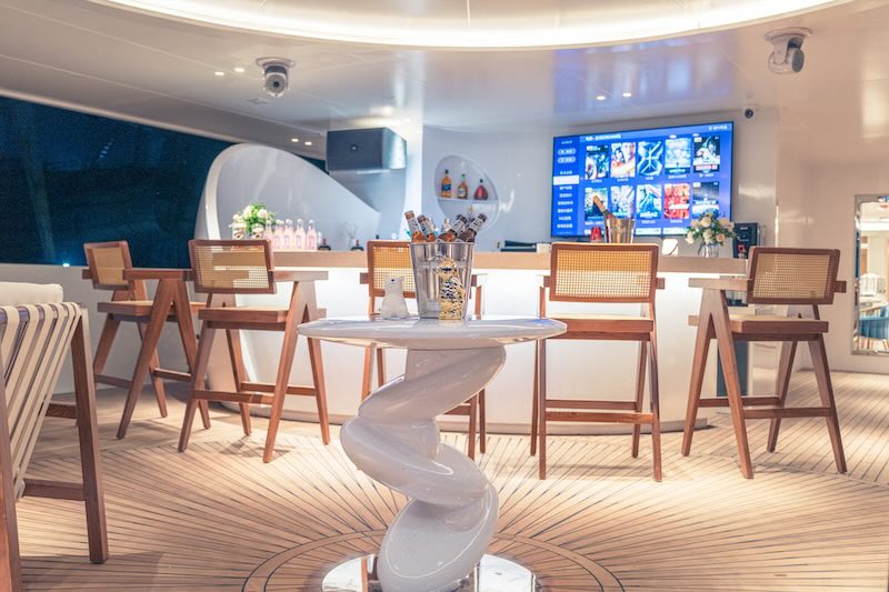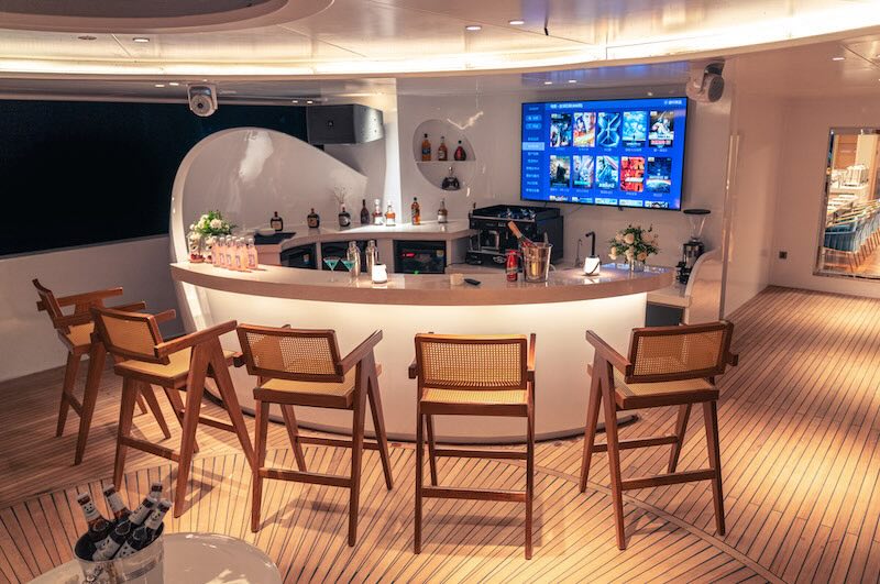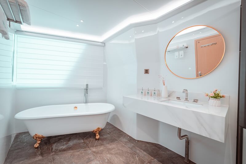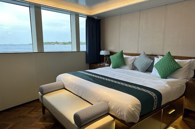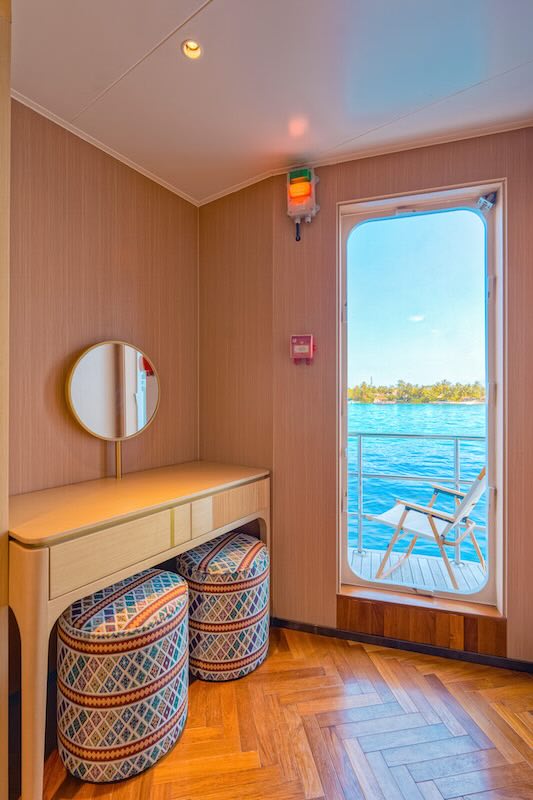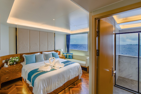 The two double bed junior suites on the main deck offer stunning sea views and are equipped with air conditioning, a television, and a safety deposit box.