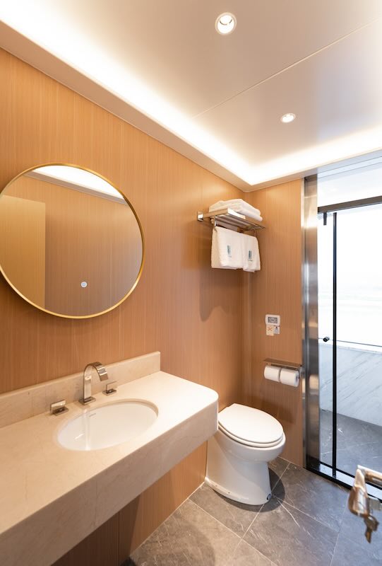 Each cabin is equipped with air conditioning, a television, and a safety deposit box.