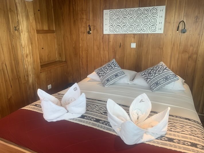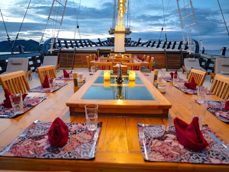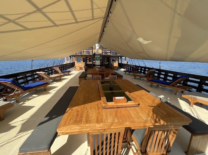 Also on the upper deck are the wheelhouse and a quiet space to relax, offering comfortable deck chairs and bean bags to enjoy the view while cruising the Indonesian archipelago.