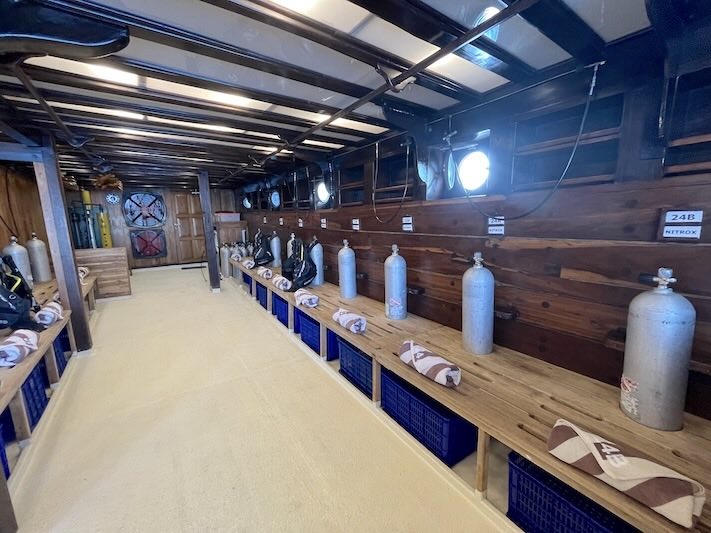 Each diver is assigned an individual dive station where their equipment is kept throughout the cruise, with tanks filled on the spot with air or Nitrox.