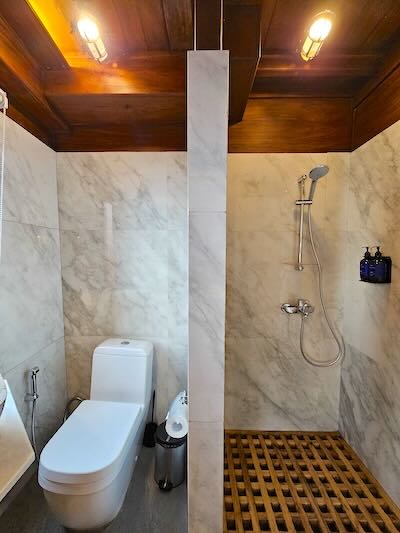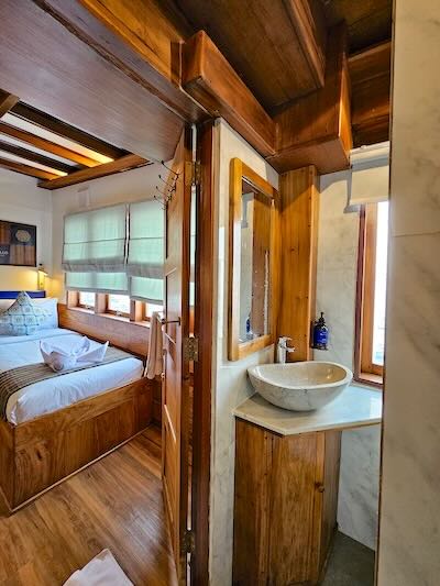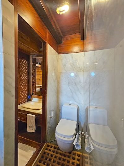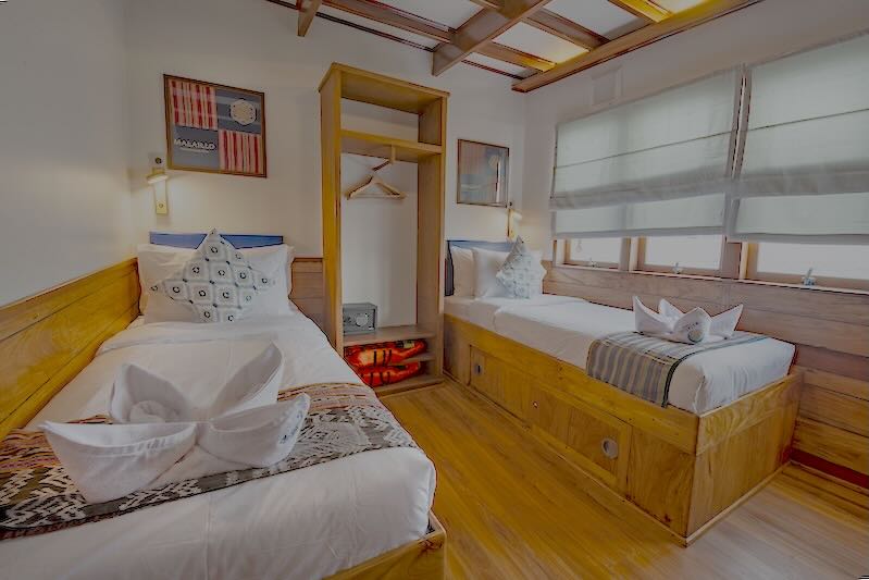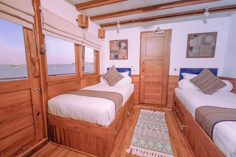 On the main deck, a 13-square-meter twin cabin offers direct access to the restaurant, along with a private bathroom, air-conditioning, and several windows for natural light.