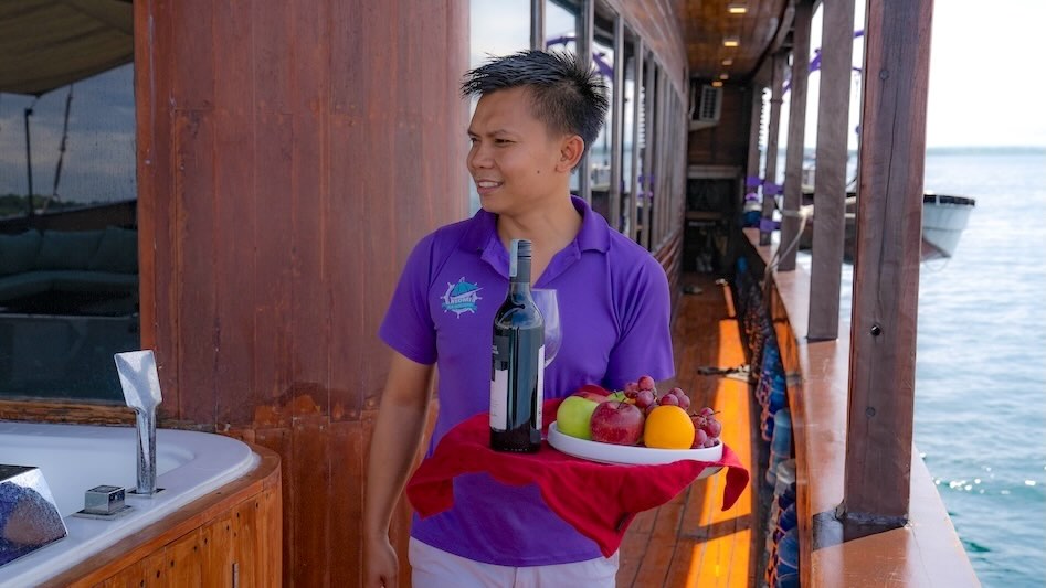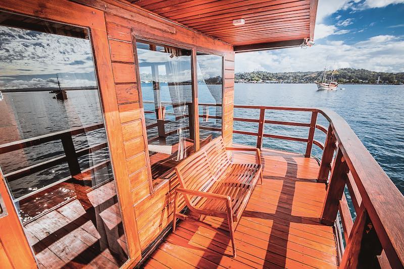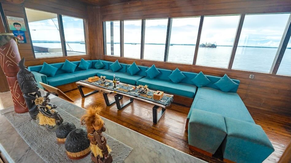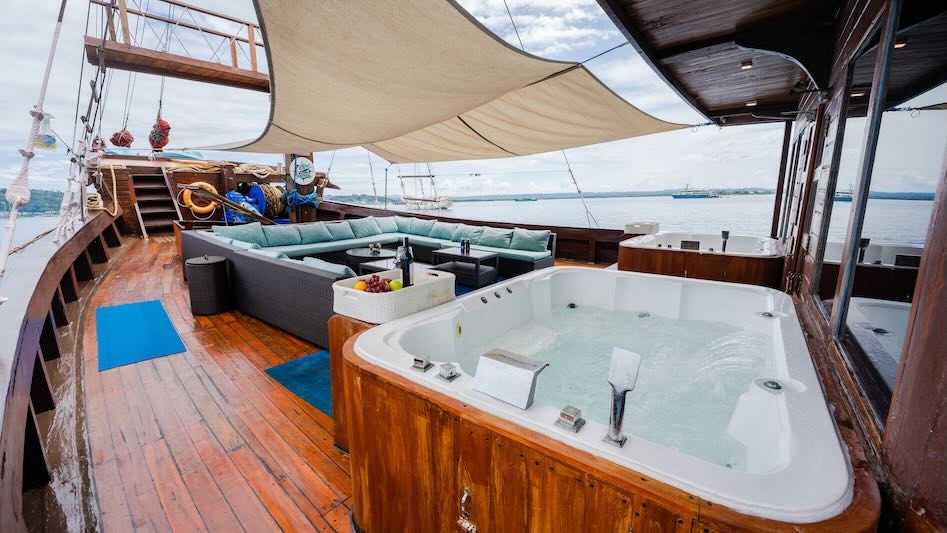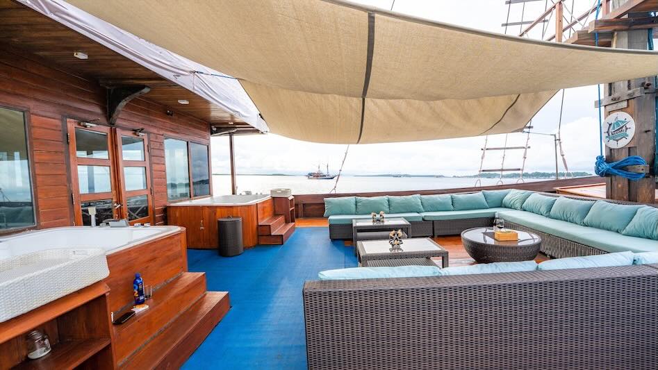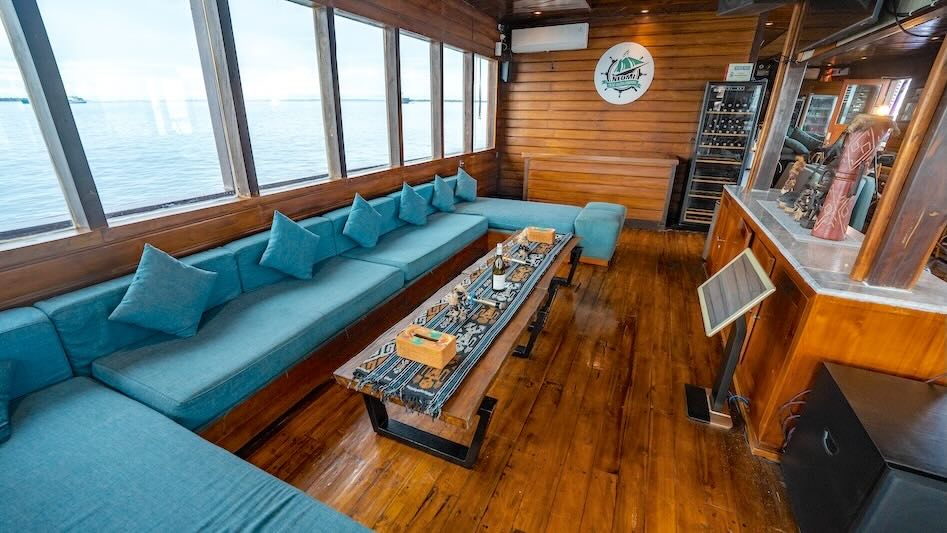 The main deck is the social hub of the ship, featuring two Jacuzzis and an outdoor seating area for relaxation while enjoying the stunning Indonesian scenery. The indoor air-conditioned salon and restaurant offer a cozy space for dining and entertainment, with a 55" TV, touch-screen karaoke, and a fully stocked bar.