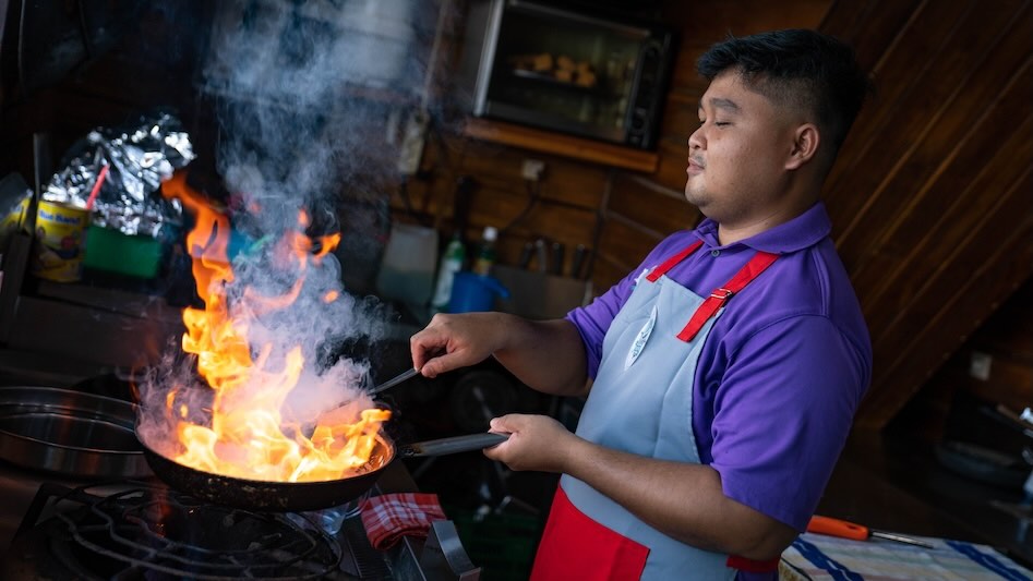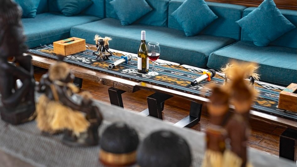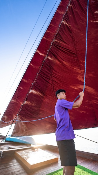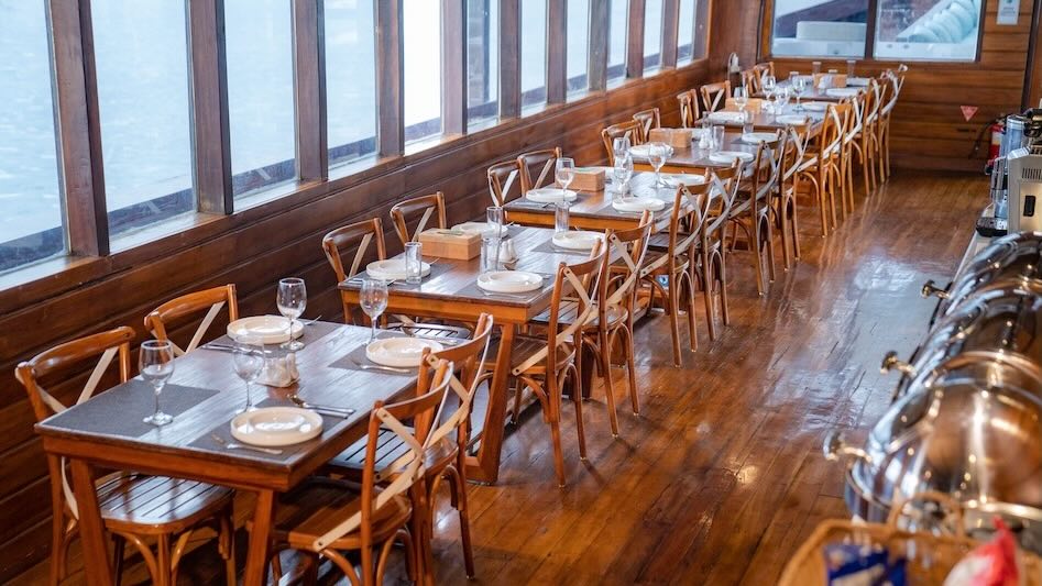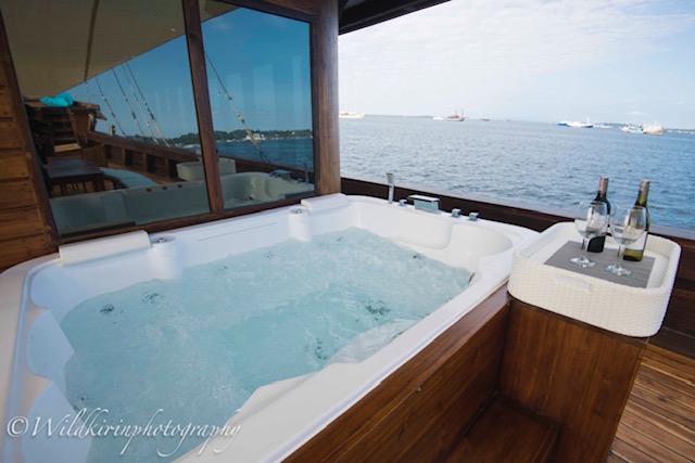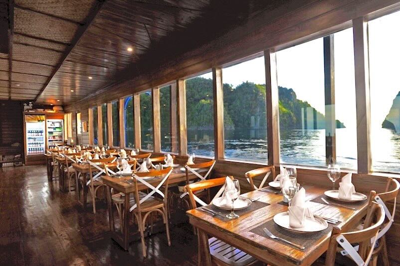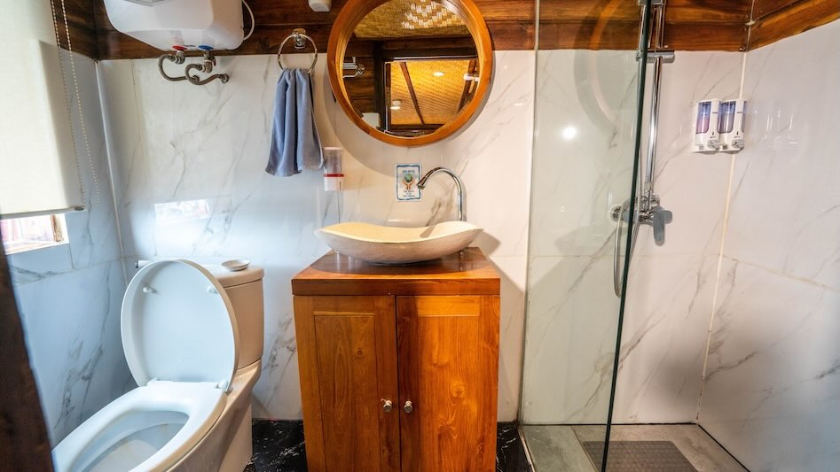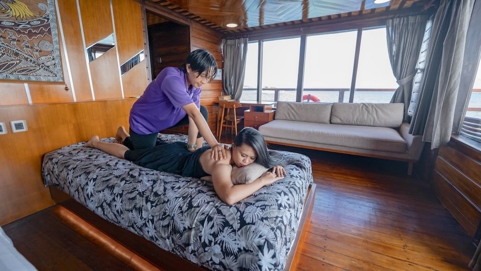 The main deck is the social hub of the ship, featuring two Jacuzzis and an outdoor seating area for relaxation while enjoying the stunning Indonesian scenery. The indoor air-conditioned salon and restaurant offer a cozy space for dining and entertainment, with a 55" TV, touch-screen karaoke, and a fully stocked bar.