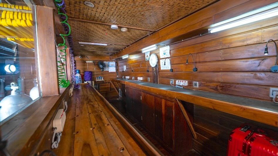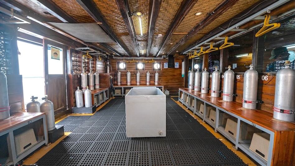 Divers are catered to with top-notch facilities, including a spacious dive deck with individual gear storage, nitrox availability, and a dedicated camera room.