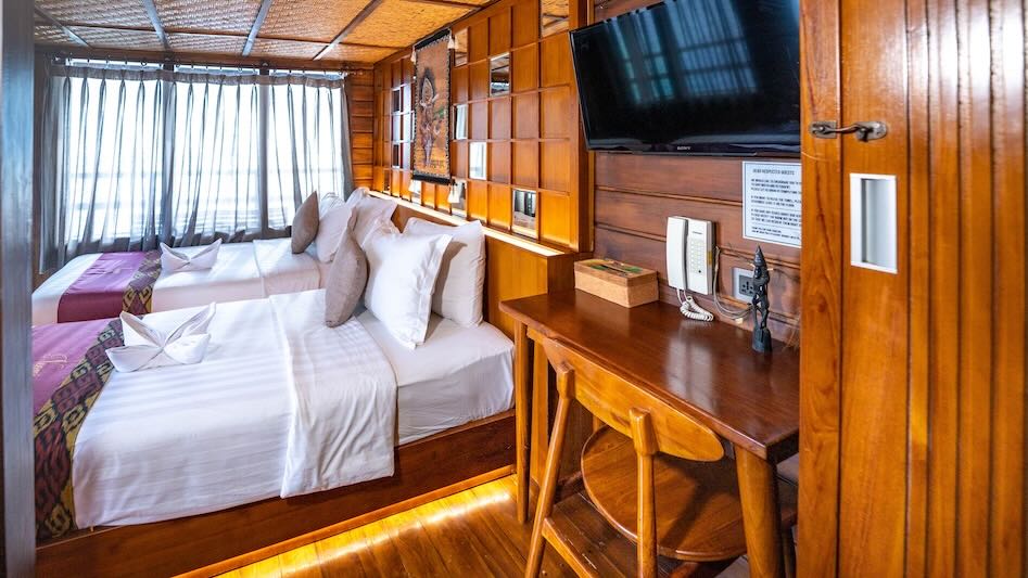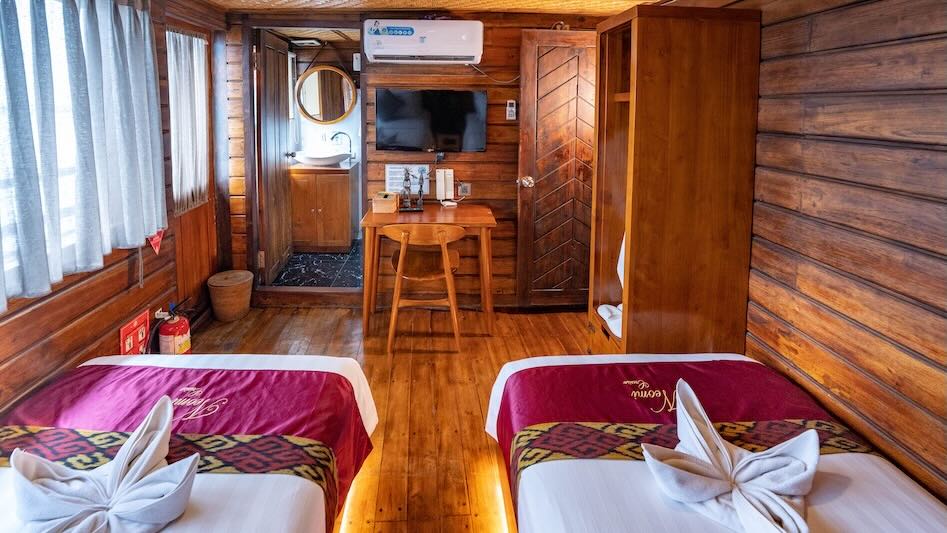 All cabins are equipped with en-suite bathrooms, air conditioning, and a safety deposit box.