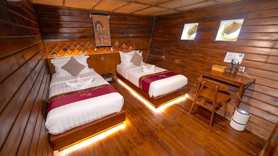 Neomi Liveaboard is a luxurious phinisi-style vessel designed to accommodate 20 guests (22 for a full charter) across 10 well-appointed cabins, offering a blend of traditional Indonesian craftsmanship and modern comforts.